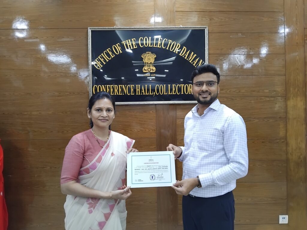 दमण डिप्टी कलेक्टर प्रियांशु सिंह ने सोमनाथ पंचायत सरपंच वर्षिका पटेल को दिया सर्टीफिकेट